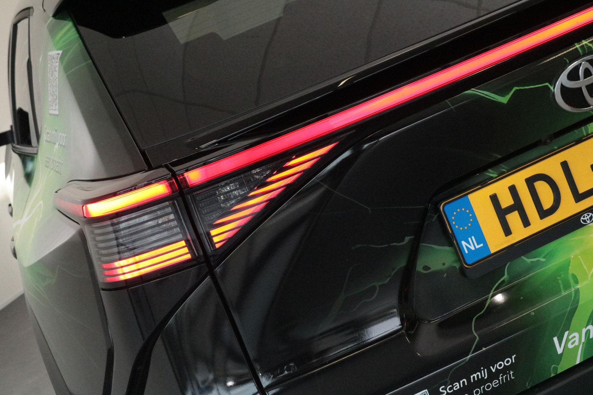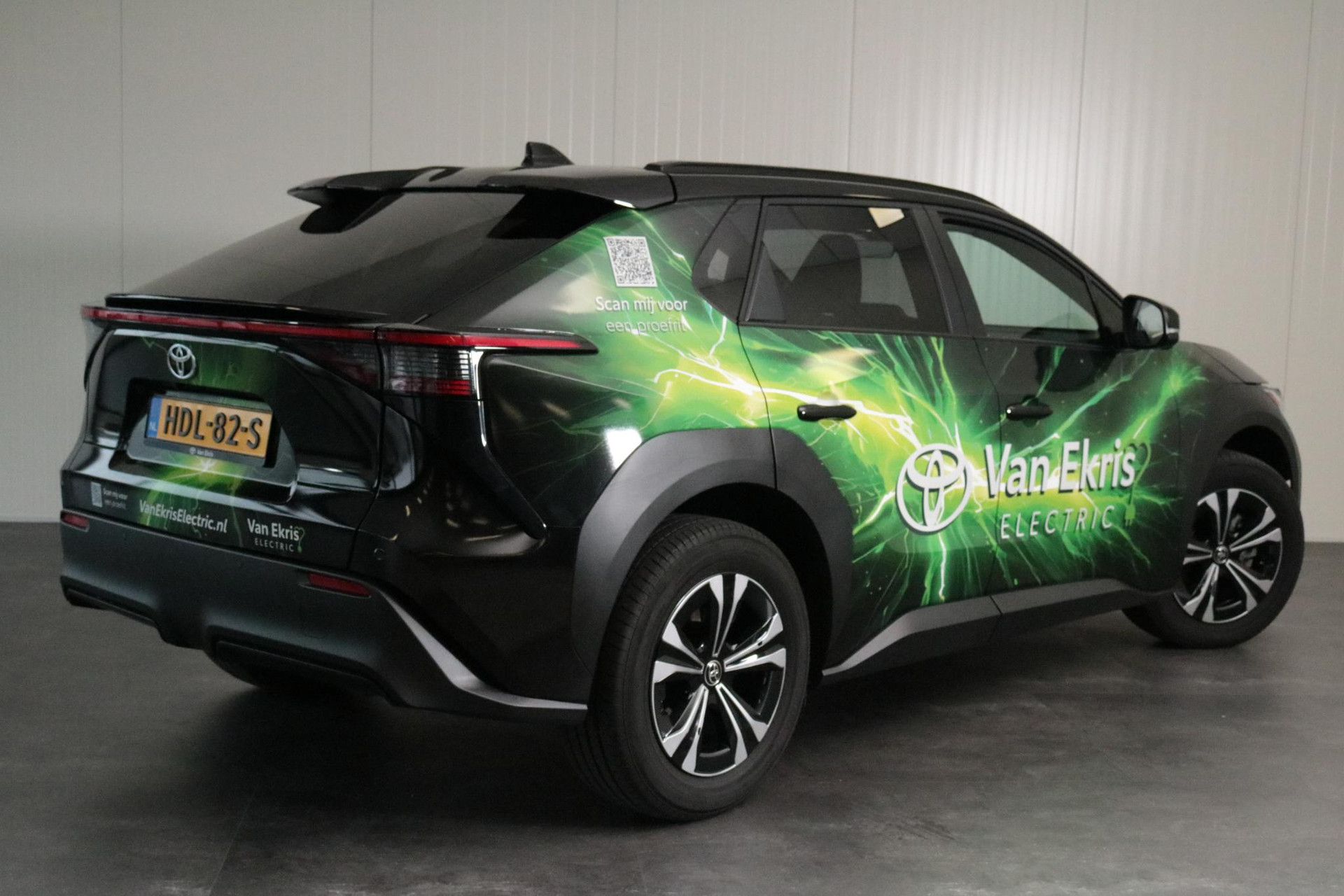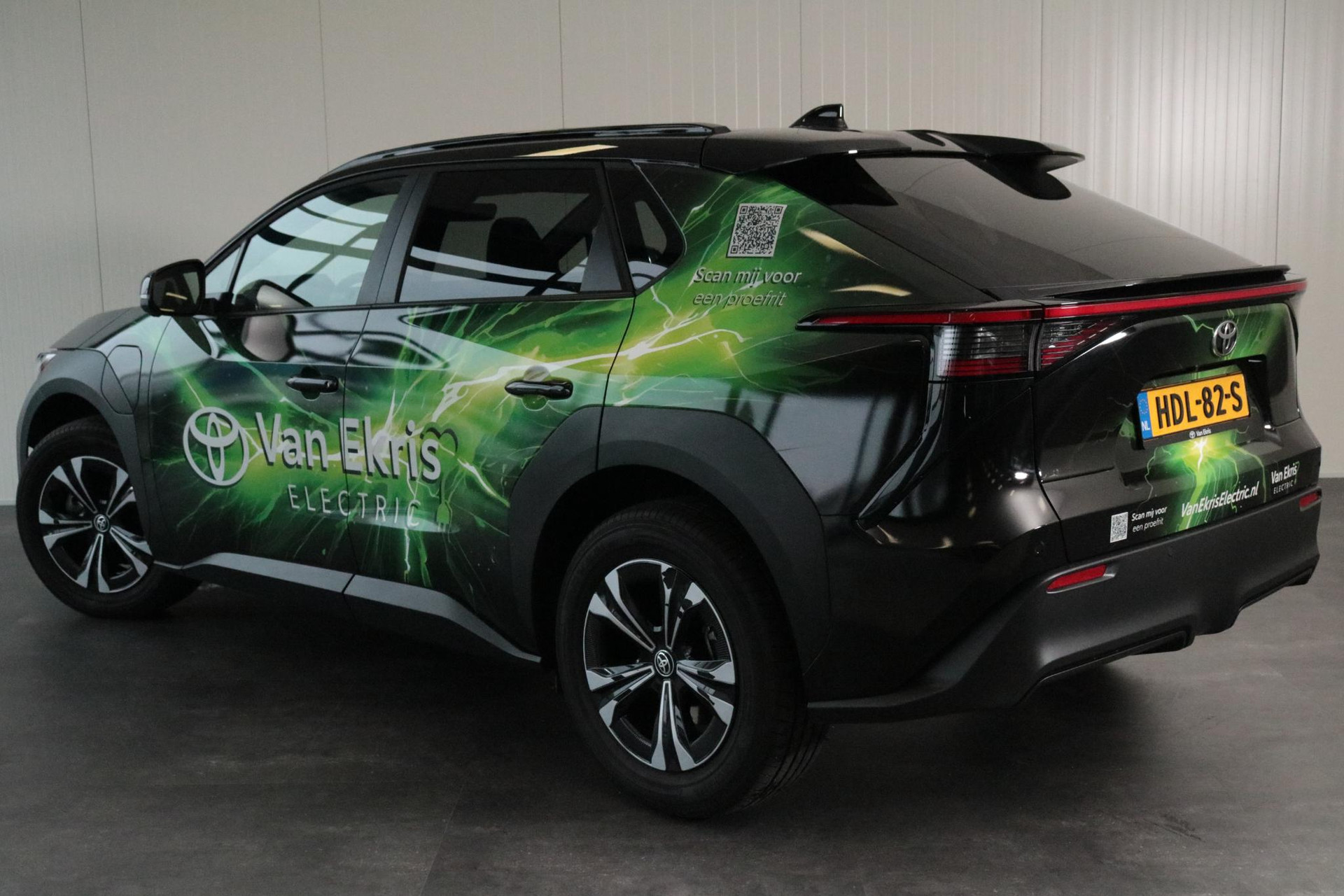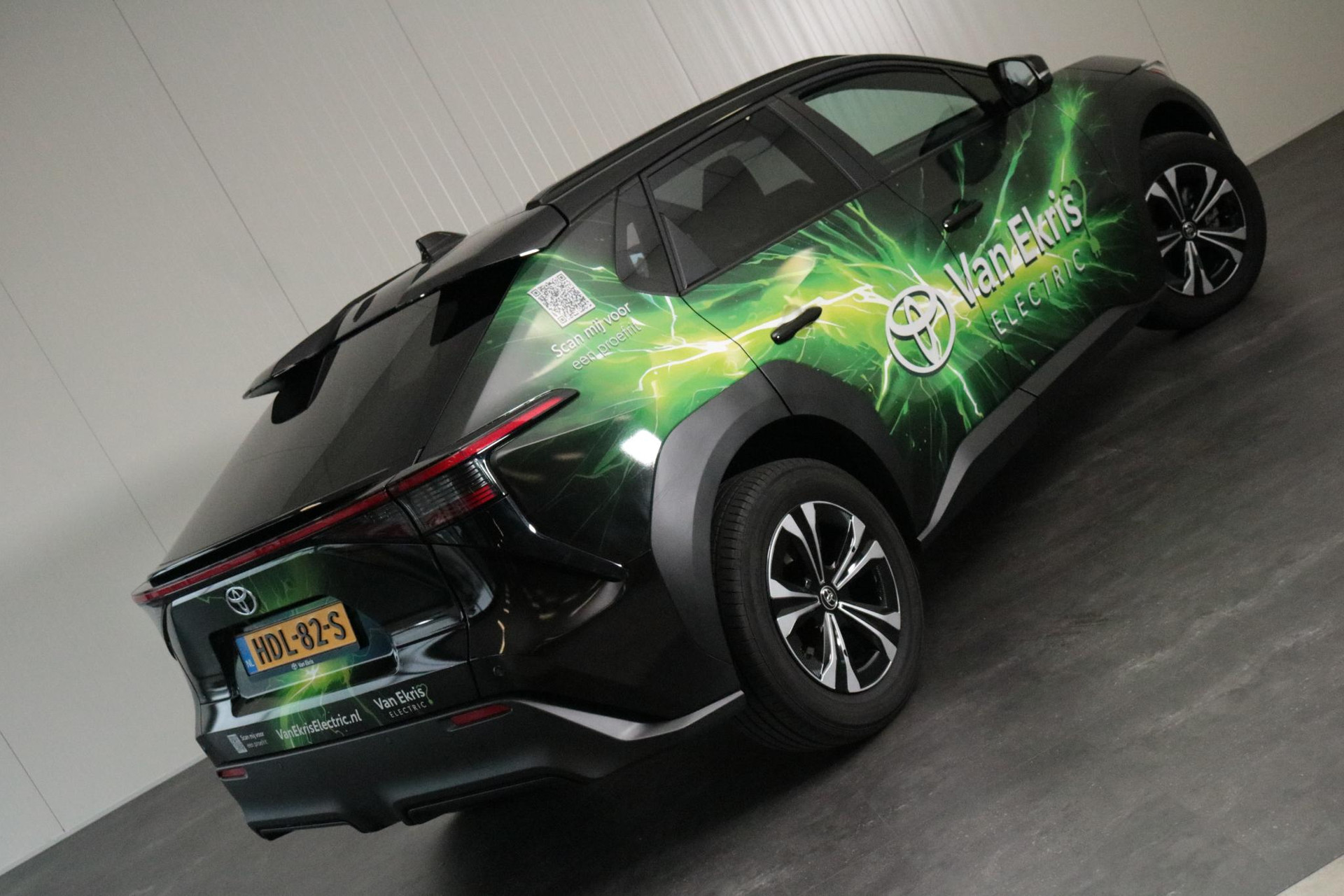 Zie je het al voor je, deze opvallend gewrapte bZ4X met jouw bedrijfslogo erop? Nu staan er uiteraard Van Ekris logo's op maar bij aanschaf kunnen we jouw logo ook laten plaatsen. De volledige wrap blijft dan zitten en maak je van deze bZ4X een rijdende reclame zuil voor jouw bedrijf!